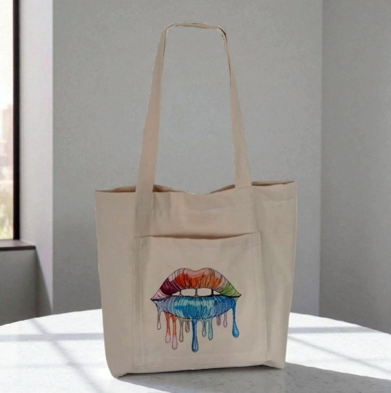 Przód torby z dużą kieszenią ozdobioną haftem. Dno torby poszerzone - tak aby mogła pomieścić wszystkie niezbędne drobiazgi i przydasie.