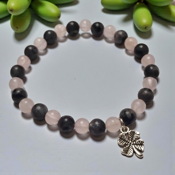 Bransoletka na gumce wykonana z kulek kamieni labradorytu i różowego kwarcu w rozmiarze 6mm, Każdy kamyczek labradorytu to odcienie szarości zaś różowy kwarc to kamyczki jasne z bardzo delikatnym odcieniem koloru różowego. Bransoletka została ozdobiona zawieszką w kształcie czterolistnej koniczyny.
