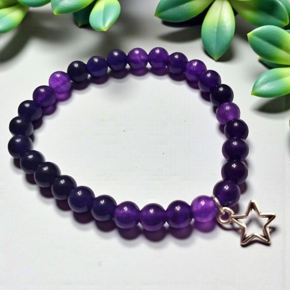 Bransoletka na gumce wykonana z kulek ametystu w rozmiarze 6mm w pięknym fioletowym kolorze. Każdy kamyczek ma swoją unikalną fioletową barwę i odcień nadając bransoletce niepowtarzalnego uroku. Bransoletka została ozdobiona zawieszką w kształcie gwiazdy.