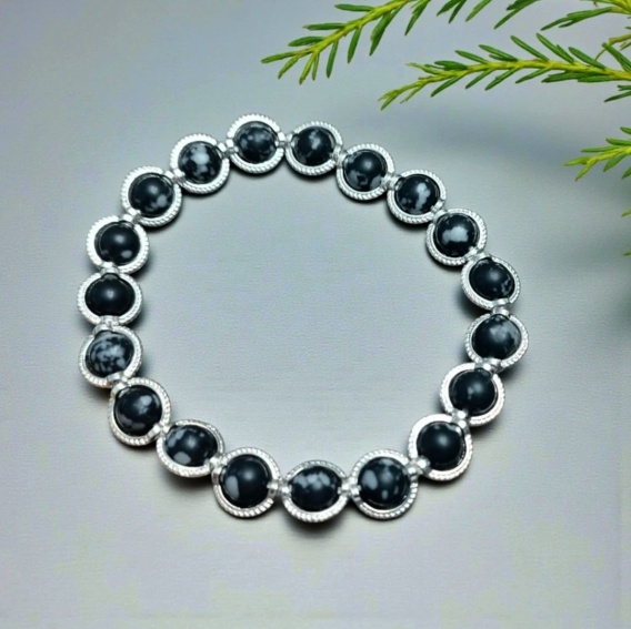 Bransoletka z naturalnych kamieni obsydianu śnieżnego to elegancka i wyjątkowa biżuteria.  Czarny kolor, szaro białe przetarcia  oraz  dodatkowe obrączki na kamykach w kolorze srebrnym dodają jej uroku.