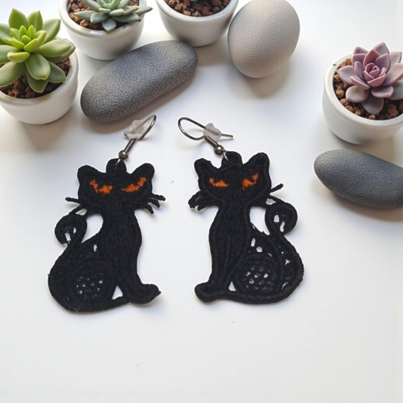 Haftowane szare kolczyki czarne koty bardzo oryginalne. Z pewnością spodobają się miłośniczkom kotów i nie tylko....
