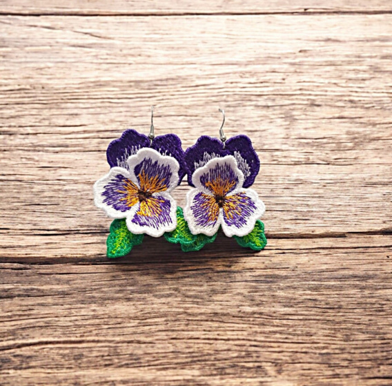 Kolczyki zrobione są z 3 wartstw. - płatek, kwiat bratka i listki. Zostały zszyte ręcznie dając efekt trojwymiarowosci.